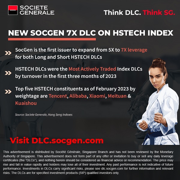 This advertisement has not been reviewed by the Monetary Authority of Singapore (“MAS”). This advertisement is distributed in Singapore by MAS licensed representatives of Société Générale, Singapore Branch. If you wish to discuss this advertisement, you should do so with your financial adviser, authorised broker or with MAS licensed representatives of Société Générale, Singapore Branch. This advertisement does not constitute or form part of any offer, or invitation, to subscribe for or to sell, or solicitation of any offer to subscribe for or to purchase, any certificates on indices/equities (the “Certificates” or “Daily Leverage Certificates”), warrants or other securities. Nothing herein should be considered as investment or financial advice or any form of recommendation to purchase or sell the Certificates/Daily Leverage Certificates, warrants or other securities mentioned. Information herein is intended as general information only and does not take into account the specific investment objectives, financial situation and the particular needs of any particular person. The price of Certificates/Daily Leverage Certificates, warrants or other securities and/or the price of the underlying asset may fall in value as rapidly as it may rise and holders may sustain a total loss of their investment. Investments in the Certificates/Daily Leverage Certificates, warrants or other securities carry risks. Any past performance of the Certificates/Daily Leverage Certificates, warrants or other securities, or past performance of an underlying asset, is not indicative of future performance. This document does not constitute a full disclosure of the risks involved. Members of the Société Générale group and/or its connected persons may take proprietary positions and may have long or short positions or other interests in the Certificates/Daily Leverage Certificates, warrants or other securities and may purchase and/or sell the Certificates/Daily Leverage Certificates, warrants/ or other securities at any time in the open market or otherwise, in each case whether as principal, agent or market maker.